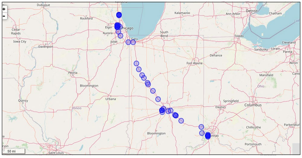 CSafe engineers tracked the containers to DHL’s SJU service center, the shipper’s manufacturing site (start location), the SJU airport and then went into flight-safe mode. When the containers landed at the CVG airport, engineers continued tracking during the truck transport to Chicago (end location).