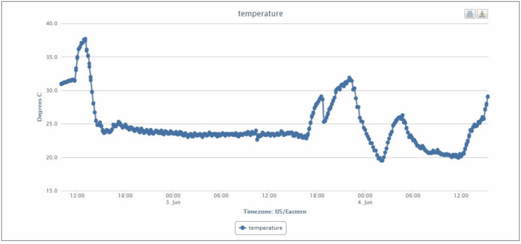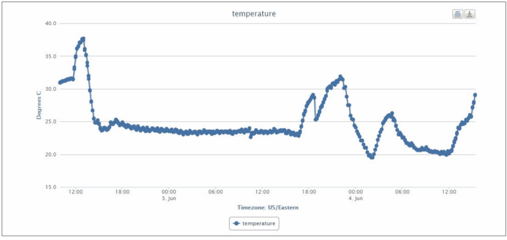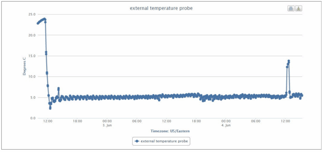 of the container and the two spikes in temperature match up with door opening events for the loading and unloading of product.