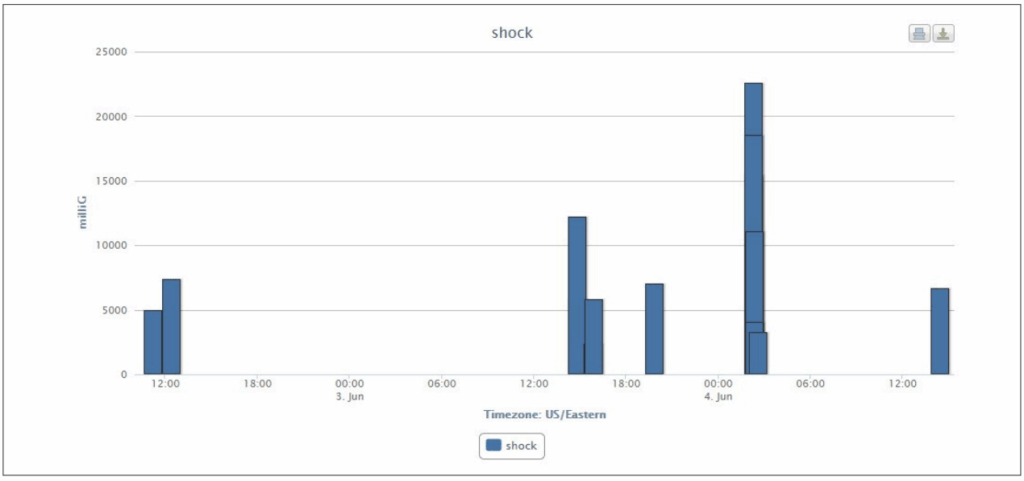 Figure 4 – Shock data transmission throughout the shipment. Aligns with forklift movements, truck bumps and airplane landing.