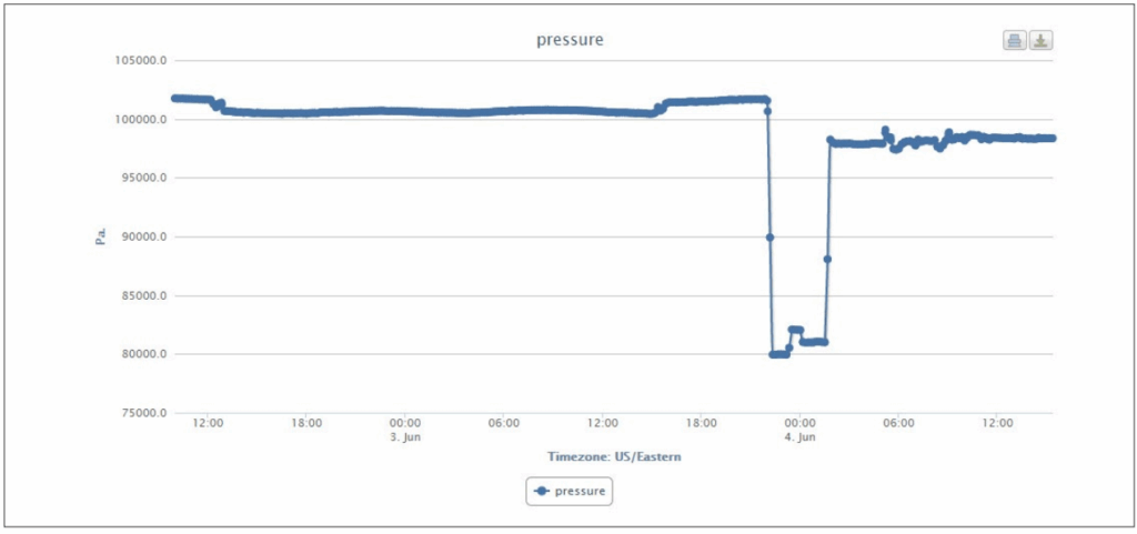 Figure 6 – Pressure experienced inside the cargo compartment of the container. The pressure decreases when the doors are opened for container unloading.